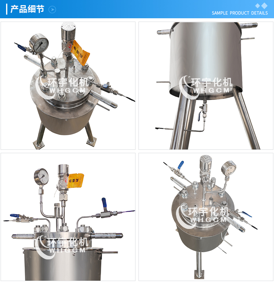 常規(guī)釜蓋開口 氣相口配針形閥,液相口配針形閥及釜內(nèi)插底管,固體加料口配絲堵,測(cè)控溫口配鉑電阻,壓力表安全爆破口配壓力表及安全防爆裝置,釜內(nèi)冷卻盤管進(jìn)、出口配水咀
